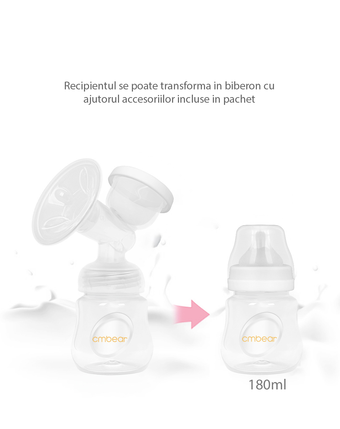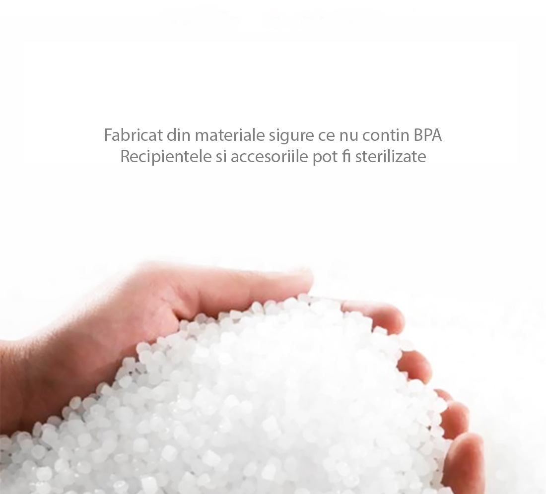 2 sticlute de 180 ml: Pachetul include doua sticlute de 180 ml, realizate din material PP de inalta calitate, care nu contin BPA. Aceste sticlute pot fi folosite nu doar pentru a stoca laptele matern, ci si ca biberoane pentru hranirea bebelusului dvs. Materialul PP este durabil, rezistent la temperaturi ridicate si poate fi sterilizat in mod eficient, asigurand igiena maxima.
